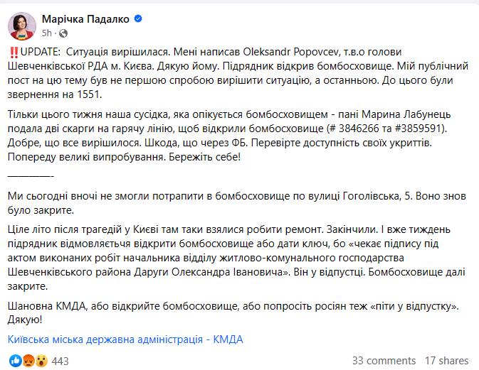 "Вже тиждень підрядник відмовляється відкрити бомбосховище або дати ключ, бо "чекає підпису під актом виконаних робіт начальника відділу житлово-комунального господарства Шевченківського района Даруги Олександра Івановича". Він у відпустці. Бомбосховище далі закрите", — повідомила Марічка Падалко в соцмережі.