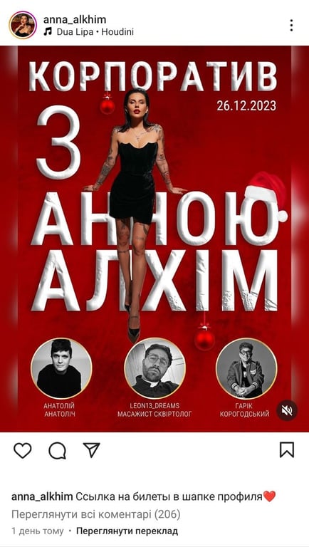 Но 26 декабря он проведет ивент Анны Алхим. Билеты на так называемый корпоратив стоят от 5 до 38 тысяч гривен, поэтому телеграмм-каналы предположили, что Толич согласился ради неплохого гонорара.
