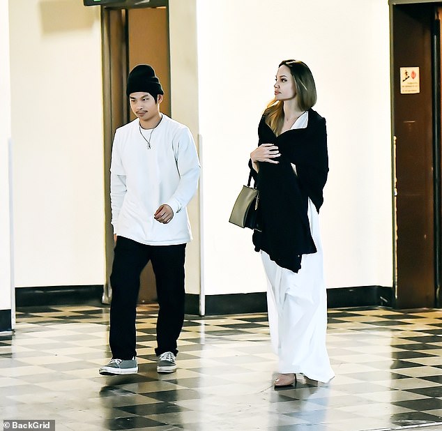 Актриса поразила золотистыми волосами медового оттенка, но ставила свои корни темными. В тот вечер она надела объемный свитер поверх длинного белого платья. Дополнила образ черным кожаным кошельком и каблуками. Пакс выбрал реглан, черную шапку и брюки в тон.