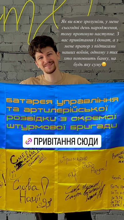 Именно поэтому в свой день рождения он объявил сбор на потребности Третьей отдельной штурмовой бригады. Одному из тех, кто пополнит банку, Середа пообещал подарить флаг с подписями военных.