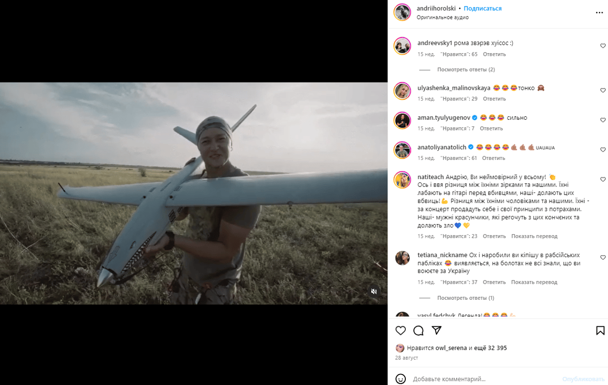Не так давно лидер украинской группы "Бумбокс" Андрей Хлывнюк, который сейчас служит в ВСУ и является оператором дронов, высмеял известную российскую группу "Звери". Певец снял забавное видео, где ответил солисту этой группы Роману Билыку, который ездил выступать перед россиянами на Донбассе.