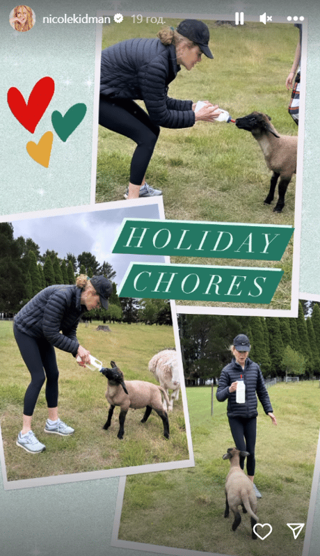 56-летняя актриса опубликовала три фотографии в сториз своего Instagram. Звезда лаконично отметила, что занимается праздничными делами. Она имела в виду уход за животными, в частности, кормление козлят из бутылочки. Для работы по хозяйству Кидман надела пару черных леггинсов и пуховую куртку в тон. Она дополнила образ черной бейсболкой и кроссовками.