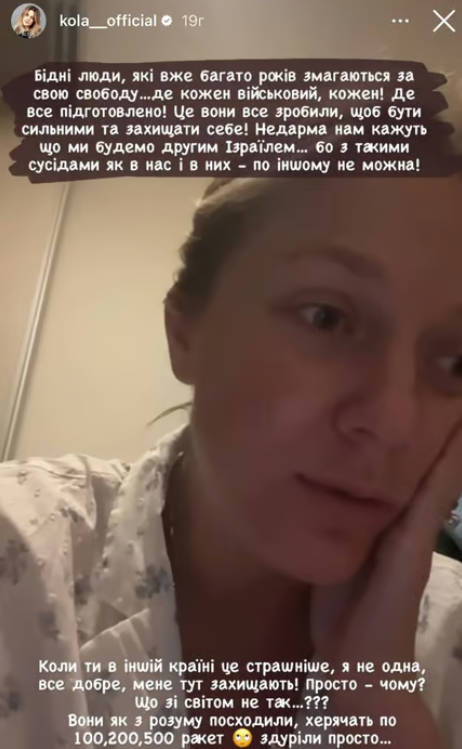 "Я в Ізраїлі, і це треш. Я з однієї війни приїхала в іншу війну. В іншій країні це страшніше. Чесно, вони, як скажені, вони як з розуму посходили. Вони по 100, по 200, 500 ракет за раз х*рачать просто. Ці звуки… Це треш. Мій рейс скасували, поки я не розумію, що робити. Я перебуваю в чужій країні, де неадекватні сусіди-іроди з усіх боків… Які неконтрольовані і можуть робити все, що їм прийде в голову", — зазначила KOLA.