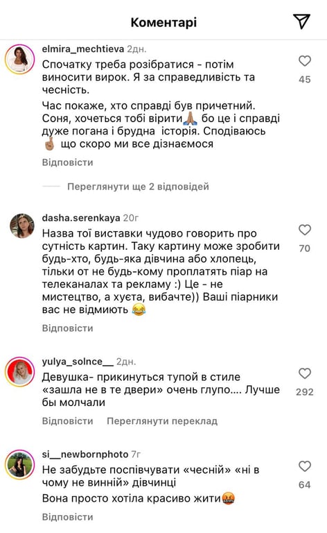 Коментарі під дописом Соні Морозюк. Фото: instagram.com/sonya.moroziuk/
